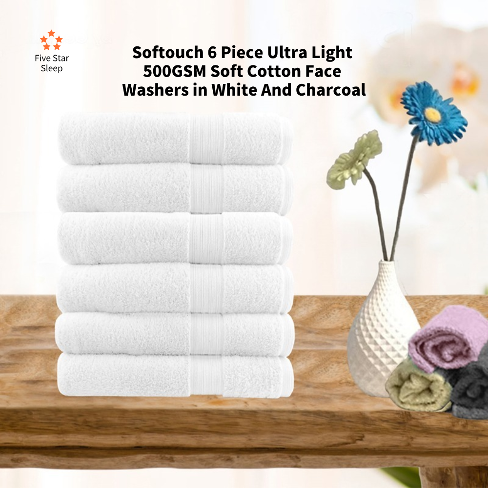 Softouch 6 Piece Ultra Light 500GSM Soft Cotton Face Washers in White
